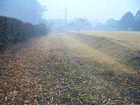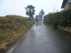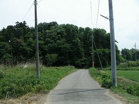 | 町道によって城址は南北に分断されている。城のある台地は比高10mほどである。 | 西側は幅20mほどの水田によって区画されている。これが堀の跡であろう。 |
