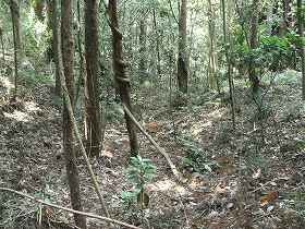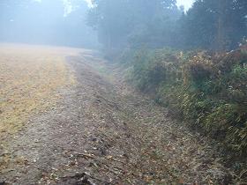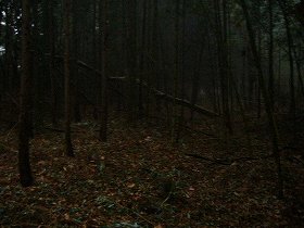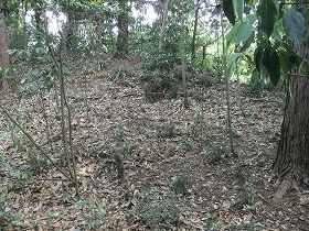 | 北側の堀。雨の上に藪だから暗くて、こんな感じでしか映らない。 | 1郭南側の堀。だいぶ埋まっているようだ。 |