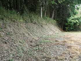 畑地の中央を抜ける道の30mほど北側に写真のような虎口がある。ただし、これは上の墓地に車を通すために後世切通しにしたものかもしれない。ここを上がると南北に切りとおしの道、西側に低い土塁らしきものがあるが、これも遺構かどうか確信はもてない。これが遺構とすれば、中央の切通しの部分を挟んで、東西に郭があり、ここが城の中心部であったかと思われる。