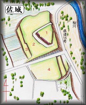佐城は、国道408号線の「北部工業団地入口」のバス停の辺りの信号を東に800m行ったところにある。やがて道は県道19号線に突き当たるが、その手前の、道によって削られた比高10mほどの台地上が城址である。