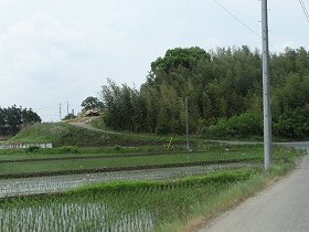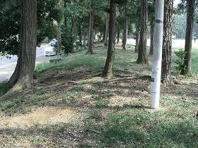 場所は県道200号線の南側で、「ゆかりの森」の北西500mほどの所である。写真のような高さ2m、の土塁が20mほど残っている。西側は耕地整理で削られた感じがするし、また東側も神社の敷地となって削られた跡がある。それゆえかつてはもっと長く延びていたのではないかと思う。