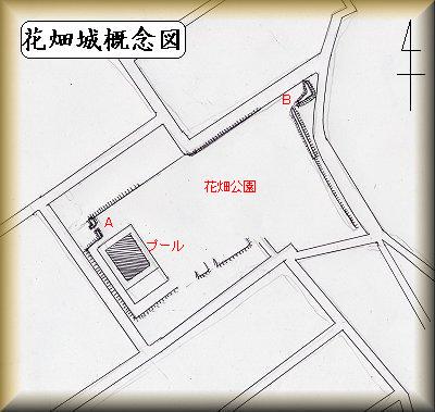 花畑城は、花畑3丁目の花畑公園の敷地内である。この公園そのものが城址であった。といっても、城は平地の居館で、例によって、土塁を用いて堀を埋めてしまったらしく、堀もほとんど消滅、土塁も根の部分しか残っていないと言う状態である。それでも公園の北西部には虎口の跡、南東部には屈曲しながら連なる土塁の跡が見て取れる。東側の畑は一段低くなっていて、これが水堀の跡であろう事は確認できる。