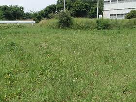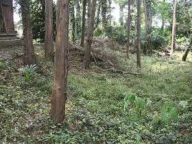 | 丸の内部分。この辺りが城の中心部分だったと思われるのだが、明確な遺構はない。しかし、写真の部分はわずかに高くなっており、城塁のように見えなくもない。 | 宇賀神社の祠(といっても潅木に囲まれておりよく見えない)とその脇にわずかに残る堀の跡。堀は深さ50cm、幅6mほどである。 |