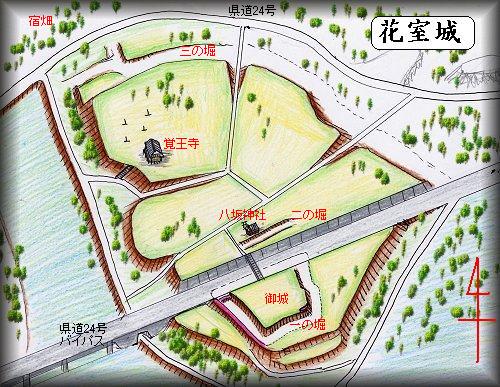 花室城は県道24号線の旧道とバイパスに囲まれた、比高6mほどの低い台地上にある。かなり広大な台地で、城址の中心がどの辺りであったかよく分からないのであるが、周囲にはかつての掘であったと思われる一段低くなった水田が取り巻き、土手も城塁状になっている。地形から考えると、台地の南端の辺りが本丸であったろうか。城址内には覚王寺や八坂神社がある。