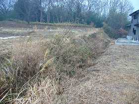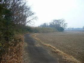 その後冬になって遺構を確認するために再度訪れてみた。「重要遺跡報告書」によれば方形に堀を巡らせているらしい。しかし、ざっと見た所明らかに遺構と分かるものはなかった。地形的には、西が小貝川の土手で、東側にも低地があり、南北に堀切を入れれば独立性の高い要害となりうる場所ではある。実際に南北には堀の跡かと思われる幅10m、深さ1m程度の低地の部分がある。南側の低地から上がった先には、枡形かと思われる土塁の痕跡も見られる。しかし、本当にそうであるのかどうか分からない。どうもこの城は、後世、地形が大分改変されているような気がする。というわけで、図面もかけないのであった。