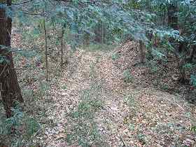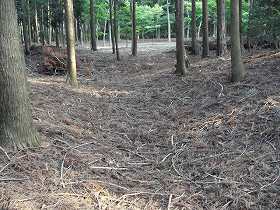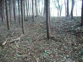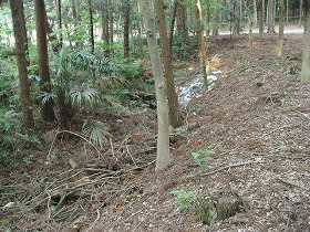 | 東側の台地にある3郭の西側の土塁と堀。きれいに残っている。深さ2m、幅4mほどである。 | 同じく北側の堀。規模は似たようなものだが、だいぶ埋まっている感じがする。 |