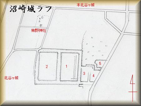 (以前の記述)沼崎城は本谷ヶ城と呼ばれる土地にあった。小川を挟んで北の篠崎地区と向かい合う地区である。県道200号線の「沼崎小前」の信号から北上する。1.5km進んだ所にある十字路を西に曲がって200m行くと、南側に芝畑が広がり、中央に小屋が一軒見える。その東側の奥が城址である。小屋の東側は芝畑になっているが、そこはかつての堀を埋めたものだという。その奥は山林になっているが、この辺りが郭であったらしい。郭の中には排水溝として用いられていたのか、溝の跡が残っている。また城の東側の堀は、畑にはなっているが、堀の形態を残している所がある。この辺りに多い、平地の掻き上げ式の城であったと思われるが、郭がどのように配置されていたのかは現在ではわかりにくくなってしまっている。
