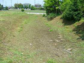 | 2郭北側の西部分の土塁を郭内から見たところ。郭内からの高さは2mほどである。 | 左の土塁の外側の堀の状態。堀の北側部分が埋め立てられて、だいぶ迫ってきている。 |