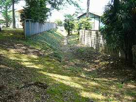 | 1郭北側の神社脇の土塁。その先は土橋となっており、虎口を形成していたもののようだ。 | 1郭東側下の横堀。これもだいぶ埋まっている。 |