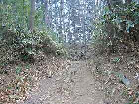 | 2郭北側の土塁。この城の土塁はとにかく上端幅が広くて2〜4mほどある。近世城郭的な雰囲気である。 | 2郭北側の虎口。手前の土橋は軽トラが走れるよう広げられているが、一応、本来のものと考えておく。 |