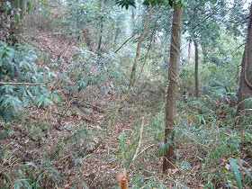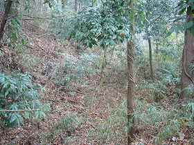 | 1郭北西側に残存している堀。深さ3m、幅6mほどと、そこそこの規模がある。 | 2郭北東辺りの堀・・・っていってもただの藪にしか見えない。 |