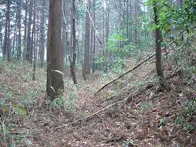 | 1郭の南側部分。堀と城塁のように見えたのだが、実際には、後世に削られた跡であるらしい。 | 1郭西側にわずかに残る土塁。 |