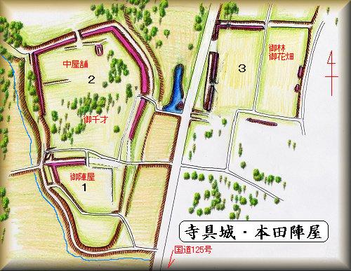 近世初期の慶長8年(1603)、小張城16000石の領主であった松下重綱は、寺具5000石の領地を維持するためにこの地に陣屋を置いた。元和元年(1615)、松下氏が烏山に転封した後、当地は10年ほどの間天領となっていたが、寛永2年(1625)、本多重良が3000石で領主となり、寺具に陣屋を築いた。そして、明治維新にいたるのであるが、つまり、当地には2度にわたって陣屋が営まれていたということになる。東西の台地にある遺構(1.2と3)はそれぞれ趣を異にしており、同じ時期に存在していたものとは思われないことから、このうちのいずれかが松下氏のものであり、もう一方が本多氏によるものだというように見ることもできるであろう。ただし遺構面だけからそれを云々するのは難しい。常識的に考えれば、5000石を管理していた松下氏の時代の遺構の方が大きいものというように見ることもできるが、それにも具体的な根拠は欠けている。地名を見てみると、陣屋地名が残っているのは、図の1郭部分である。北側の2郭にも「中屋舗」という地名があるので、陣屋に関連した屋敷が営まれていたのであろう。東側の台地部分は「御林」「御花畑」という地名で、直接陣屋施設を意味するような名称は残っていない。ということからすると、陣屋遺構は1郭部分を中心に存在していたというように見ていいだろう。