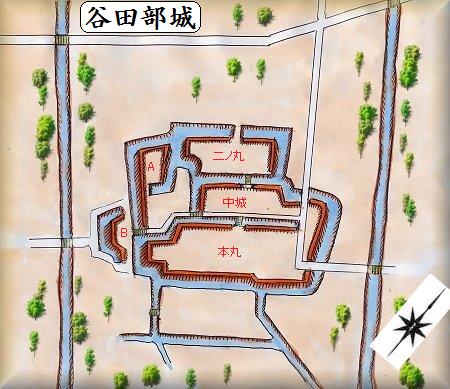 『重要遺跡報告書』に掲載されている古図を基にして、谷田部城の復元図を描いてみたが、ほぼ想像の産物といっていい。その古図、白黒印刷のため、水堀と道路が同じ色に描かれていて判然としない。さらに、その道路というのも廃城後に城を破壊して造られているようで、城の遺構とは一致していないように見られる。虎口がどこであったのかも不明である。
