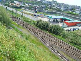 | 1郭から1mほどの段差で、先端に形成されている郭。 | 城址北側はこのように線路によって削られた断崖となっている。 |