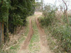 その東側の2の部分が2郭ということであろう。台地幅もかなりあり、広い郭である。ここは一面の畑となっている。この台地続きに当たるAの部分に堀跡らしき地形が見られる。といっても現在はかなり埋め立てられている様子である。しかし畑に向かう道はいったん下がって上がるようになっており、現在も堀の名残はなんとなく分かる。南側の竹やぶの中にはかつての城塁らしい地形が残されており、深さは3m程度だが、幅は8mほどもある広い堀切であったようだ。この堀切は道路の北西側に続いていたようだが、こちらもだいぶ埋められてしまっている。とはいえ、現在でも地形が窪んでおり、堀跡らしき雰囲気は伺えるのだが、なにしろヤブがひどくてその形状ははっきりと把握できない。