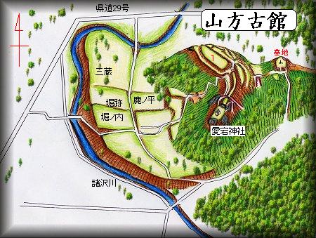 といったように見てくると、この城のプランが、規模こそ小さいが、山方城とかなり似ているというのが理解できる。この城を拡大・発展させたのが山方城というような関係である。そのように見てくると、「山方氏が山方城に移る以前の古館」という伝承は的を得ていると考えてもよさそうに思われる。以前訪れた際は地元の方に「山方城を監視するための向城だ」というようなことを言われたのだが、「古館」という地名といい、構造といい、文字通りの古館と考える方がふさわしいと思う。しかし、向城であったという伝承が残っているとなると、一時期、廃城となっていたこの城を、向城として利用するという事実があったということなのであろうか。
