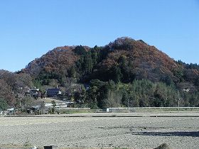 | (以前の記述)古館は、国道118号線と県道29号線とが交差するところの東南1kmのところにある比高60mほどの山上にあった。1.2km西側には山方城が見える。古館というので、山方城の前身の館かと想像していたのだが、地元の人の話によると、山方城を監視するために築かれた向かい城であったということである。山方氏は上杉氏の一族だったが、やがて佐竹氏との抗争に敗れて没落する。その頃の話なのであろう。「数年前、発掘調査が行われていたが、たいしたものはでなかったらしいよ」とも言われた。 山の右手の山頂部分には雷神様が祭られているという。道らしき道はないが、行けない事もないということだった。山頂より一段下がって、写真の左手の一段低いところにはまとまった平坦地があり、ここが中心部分であったという。 |