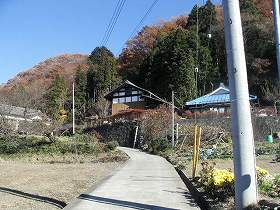 | 山方城の方向から見た古館と背後の山。山城部分は比高50mほどある。見ての通り、南側の神社のある方が高くなっている。 | 堀ノ内の北側の土塁と堀跡。「かつては堀があった」と地元の方が言っていた。 |