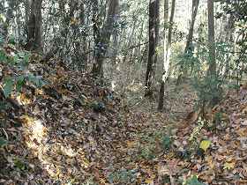 | 山頂の愛宕神社の登り口。民家の前や倉庫の裏を通って登っていく道で、かなり分かりにくい。 | 1郭の南側の尾根にある切り通し部分。虎口のようにも見える。この下には腰曲輪がある。 |