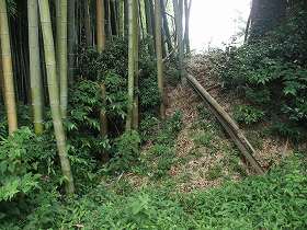 | 中城北東側の堀の跡。土塁もわずかだが残っている。 | 1郭南西側に唯一よく残る土塁。高さ3mほどもある。もともとはこのような大きな土塁があちこちに巡らされていたのであろう。 |
