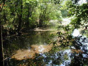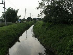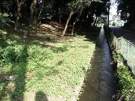 | その北側にも城塁の名残かと思われる土手がある。 | 南側の水路はかつての堀の跡であろうか。 |