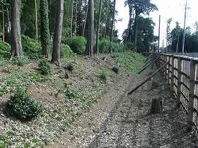 | 東側の城塁と堀。深さ2mほどである。 | 北東側の虎口。外側には土橋もある。 |
