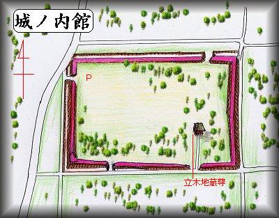 | (以前の記述) 城の内館は、結城駅の1.2km南、「文化センター前」の交差点の、200m東南にある。周囲に土塁を巡らせた方100mほどの方形の居館の跡である。 別名朝光館とも言われ、鎌倉時代に結城朝光によって築かれたと言われる。結城城に移るまでの居館であったのか、あるいは何らかの目的で、結城城の別館として設けたものであろうと思われるが、その歴史は明らかではない。土塁は1.5mほどの低いもので、北側に虎口が見られる。土塁の外側は若干低くなっているが、おそらくこれが空堀の跡であろう。内部は平坦で、現在は雑木林になっている。 城の内館は、結城氏に属する居館として存続してきたと思われるが、結城合戦以降は廃城になったものと想像される。 |