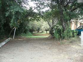 | 県道の北側のガサヤブは土塁の跡である。 | 左の土塁の脇には案内板が建っている。 |
