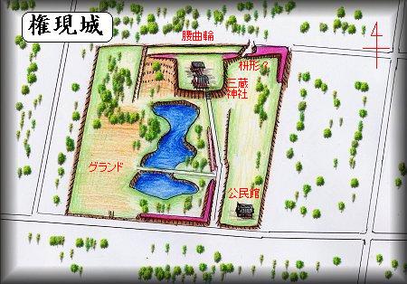 | (以前の記述) 権現城は、現在、田間の三蔵神社の境内となっているところにあった。この神社の周囲には所々土塁が残っている。失われている部分も多いのであるが、復元してみると、方160mほどのかなり大規模な方形館であったことが分かる。 土塁の高さは1,5mほどである。通常、その外側には堀が巡らされていそうなものであるが、その痕跡は現在では見られない。 境内には写真の大きな池がある。最初水堀なのかと思ったのであるが、どうやらこれはかつての庭園の名残の池であるらしい。水はよどんでいるが、なみなみと湛えられている。 城主等歴史は未詳であるが、土豪層の居館であろうか。 5月3日、この境内を歩いている途中、またヘビを踏みそうになってしまった。(薮ではなく、参道で、である) この時期のヘビは、人のいるようなところにも出てきて、まだよく動けないのかじっとしていることが多い。そのため、下を見ないで歩いていると、うっかり踏んづけそうになってしまうのである。まったく冷や汗ものだ・・・・・・。 |