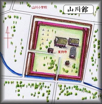 上山川の東持寺が山川館の跡である。寺院そのものもわりと分かりやすいし、隣接して北側に山川小学校があるので、途中何ヶ所かにある「山川小学校」の案内表示にしたがって進んでみてもよいだろう。東持寺の周囲に来ると、土塁と堀が実にきれいに残されているのに驚くと思う。