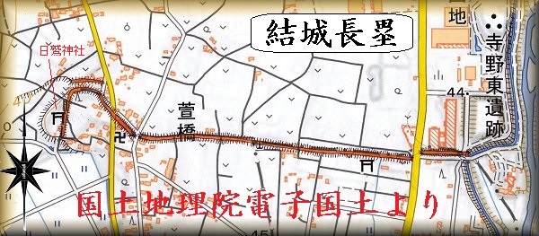 結城市萱橋の日鷲神社から、東側の寺野東遺跡の南側まで、かつて台地を横切るようにして長塁が形成されていた。