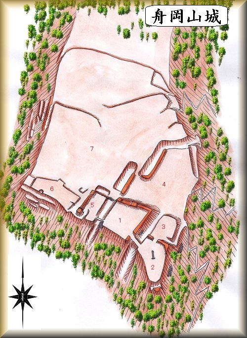 | 舟岡城の歴史について、詳しいことはよく分からないが、鳥越城のある谷合部に進入する手前に位置しており、鳥越城の出城の1つとして整備されていた山城であったと想像される。 天正8年(1580)、織田勢は、白山地域に侵攻してきて、鳥越城・二曲城などが攻め落とされてしまった。舟岡城も、それと連動して落城してしまったものと推定できる。 豊臣政権下においては、当初は丹羽長秀の家臣早谷五左衛門が、後には前田利家家臣の高鼻石見守らが城代として入城していた。 城内の各所に見られる石垣や、現在見られるような堀や土塁の規模は、戦国末期の丹羽氏や前田氏によって改修された所以であったと想像できる。 |