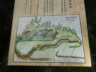 | 脇に復元図が書かれている。確かにあちこちに石垣は見られるのだが、これはちょっとやりすぎである。 | 2郭の城塁が見えてきた。ところどころに石垣も見えている。 |