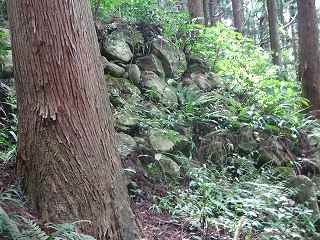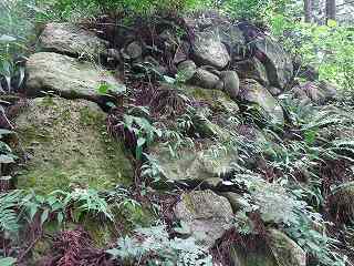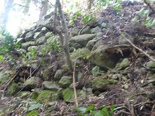 | 堀底先端部にも石垣が見られた。 | 4郭の堀と土塁。かなり大規模なのだが、ヤブで把握しづらい。 |