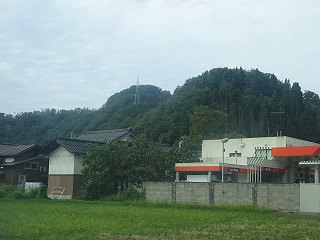 | 西方から遠望する二曲城。ここからの比高は100mほど。中央の一番高いところが1郭である。 | 北西側にある城址入口。脇には縄張り図付きの案内板もある。 |