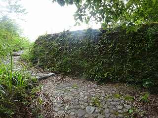 登城道は、傾斜が緩やかなため、かなり横に長くジグザグに歩きながら山頂を目指していくようになっている。こうして進んで行くと、その途中から2郭や3郭の城塁が見えてくる。この城塁の途中には石垣が積まれていた。しかし、斜面全体ではなく、あくまでも一部分だけの構築に留まっている。防御のためというよりも、見せるための石垣であったようだ。