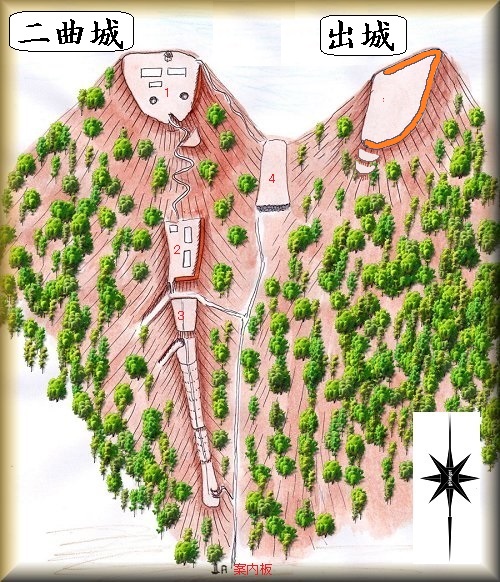こうしてみると、二曲城は2つの山頂にそれぞれ郭を配置するといった形式の山城であり、「二曲」と言う名称は、そうした形状にちなんだものであったのかもしれない。