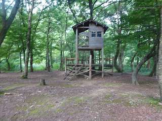 | 各所に立てられている「もののけ」の表示。これにしたがって進んで行くと、公園内を一周することになる。 | 城内には物見台状のものが建てられていた。 |