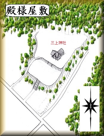 三坂にある三上神社が殿様屋敷の跡である。したがって、三上神社を目指していけばよい。駐車場はないのだが、神社入口の辺りは道路幅が広くなっているので、寄せて停めておいても大丈夫だろうと思う。