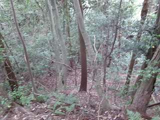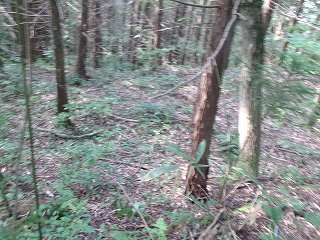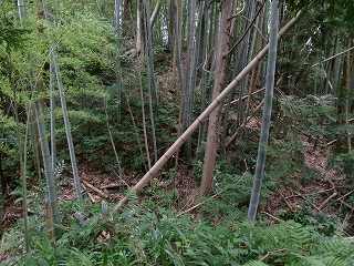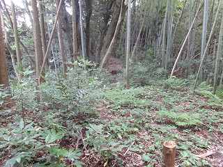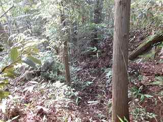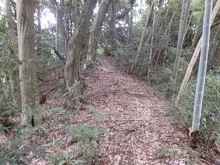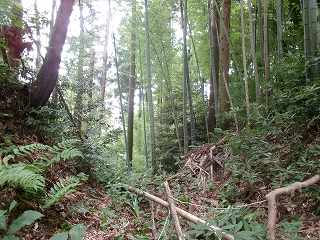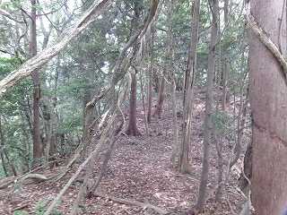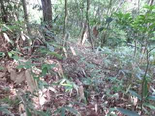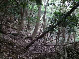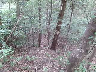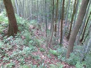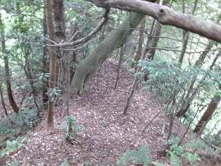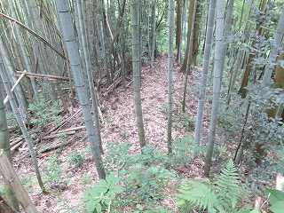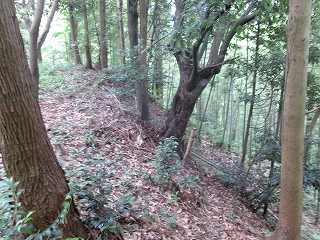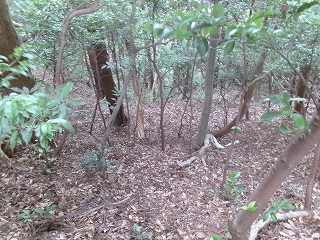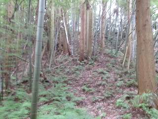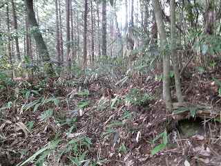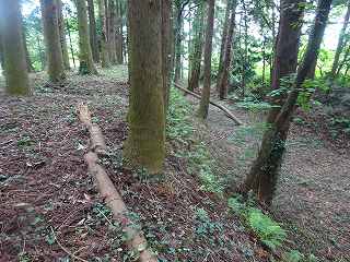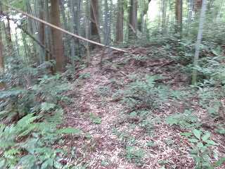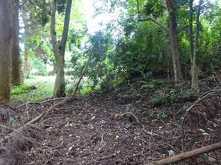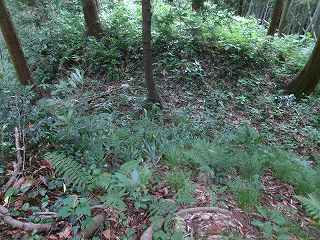 この先には堀が2本あるように見えるが、これもヤブでよく分からない。切通し状になっている部分を登って行くと、3郭の側面部に出てきた。