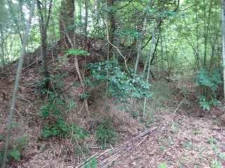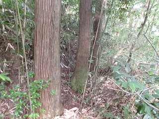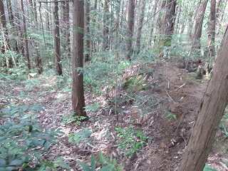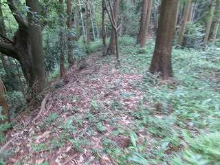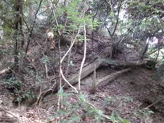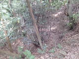 | この辺りから城内らしく堀切状のものが見えてくる。 | 城塁と堀切。 |