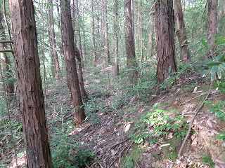 やがて道は切通しに差し掛かって行く。左手には平場がいくつも造成されている。この辺りから城域内に入っているのだと思われる。しかし側面部の平場はいずれもヤブに覆われているので、その形状は把握しづらい。