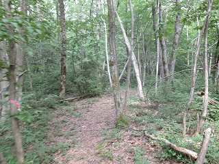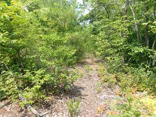 標柱の周囲がヤブ化しているために分かりにくいのだが、このヤブを少し突破していけば細い山道が付けられているのが分かる。