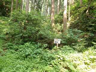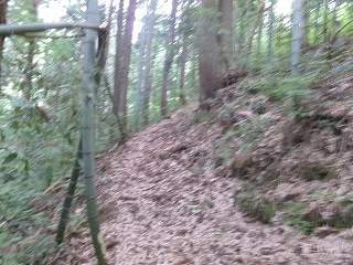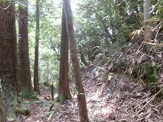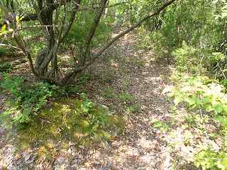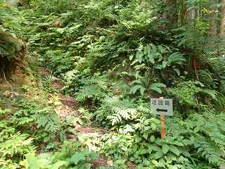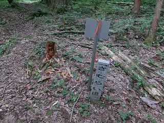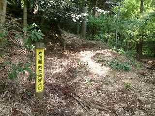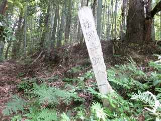 後で分かったのだが、おそらく正規の登城道は、ここから左手(北側)に進んで、さらにその先を右手の山稜方向に入り込んで行った所にあり、墓地の脇に「本丸跡登り口」と書かれた標柱が立てられている。