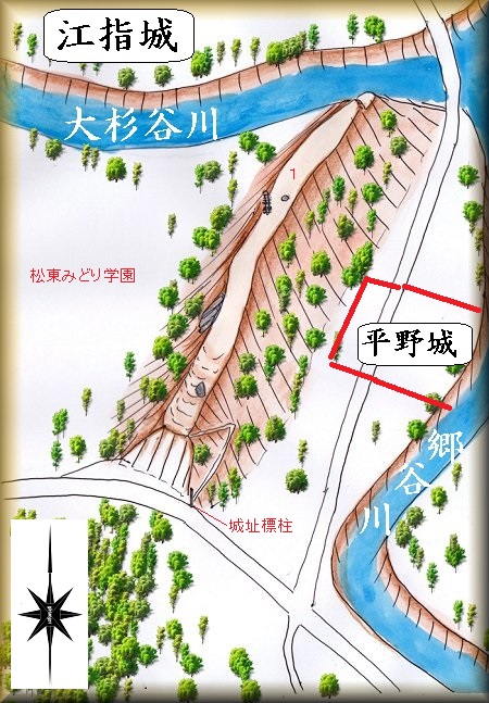 江指城の場所。 城址標柱のある登城口。 平野城の場所。