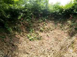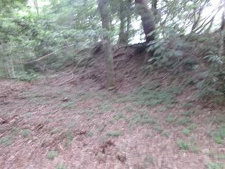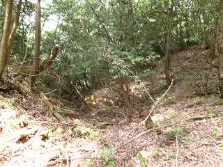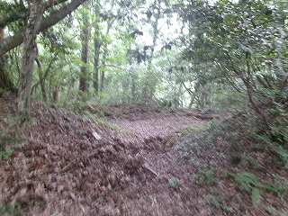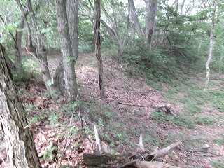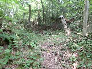 上の城から下の城へと接続する尾根があり、それを降りて行った先に堀切がある。この堀切を越えたところが下の城である。