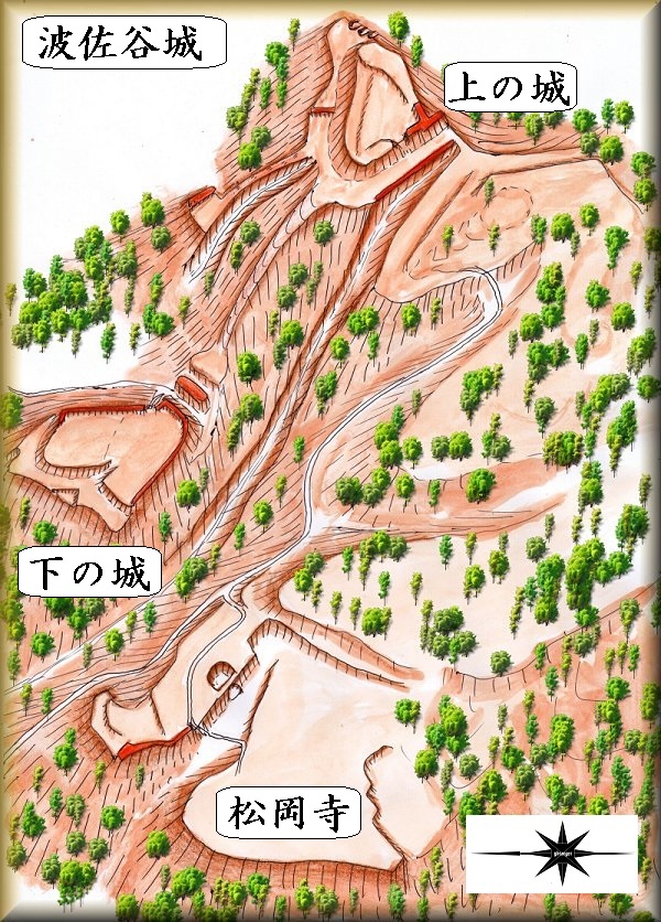 上の城は比高70m、下の城は比高40m、松岡寺は比高30mほどの所にある。