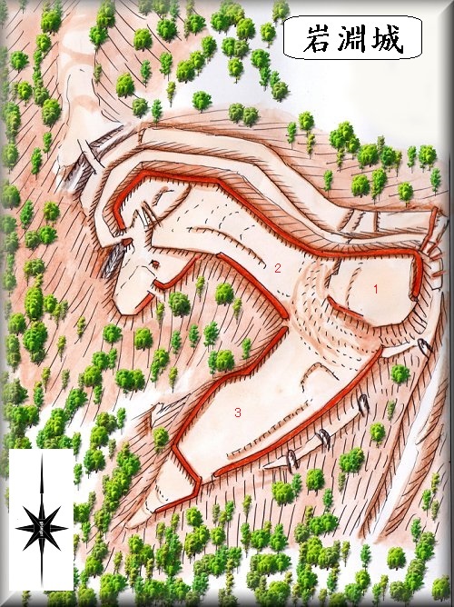 岩淵城は小松地区の平野部から山稜地帯に入る入口近くに築かれている。比高110mほどの山稜である。