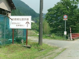 山麓の国道360号線を通って行くと、この場所に「岩倉城氏遊歩道 200m先に駐車場あり」という看板が立てられている。